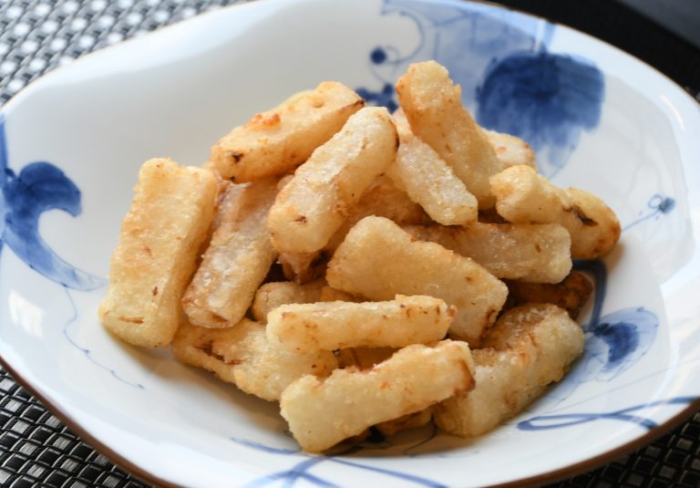 3片栗粉をまぶし、油で揚げる。