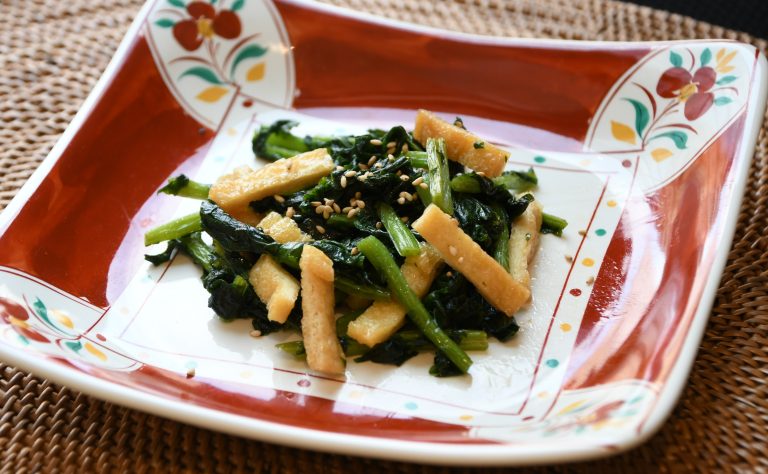 2沸騰したお湯に塩少々を入れ、茎のかたい部分を1分ほどゆでる。葉の部分も入れて30秒~1分ほどゆでて、冷水で軽くすすぐ。水気を軽く絞り、ごま油で油あげと一緒に炒める。