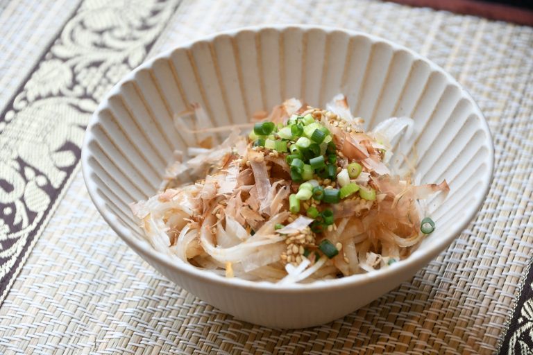 1ダイコンをスライサーで薄切りにし、千切りにする。